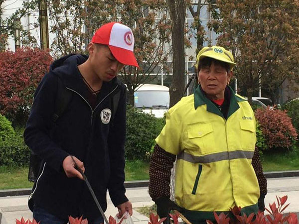 “风信子”和“杜鹃花”团队则将温暖送给了环卫工人和就医的老人。“杜鹃花”团队考虑到环卫工人工资低、工作任务重、社会地位低等因素,用自己的实际行动给他们送去温暖。他们帮助环卫工清扫垃圾、送去自己准备的礼品和环卫工人聊天,让这些马路天使感受到来自大学生的温暖。“风信子”团队则来到五院当健康信使,帮助行动不便的老人、重病人、残疾人就诊。