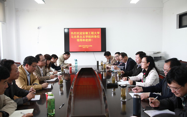 双方还就马克思主义学院建设规划、马克思主义学院机构人员的配置(领导职数、办公室人员职数、教师编制数)、思政课教师的社会考察、实践教学、形势与政策课教学、研究生培养质量及就业等情况进行了交流。座谈会交流中,安徽大学一方也十分赞赏我校马克思主义学院立足工科特色在思政课教学改革以及在科研成果上取得的一系列成绩。双方都表达了进一步加强交流与合作的意愿。