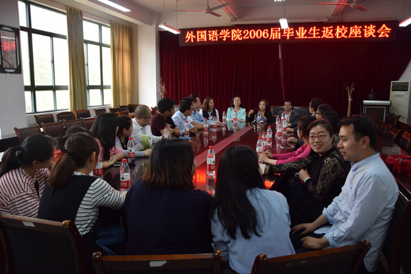 4月30日下午,外国语学院2002级本科生在学院会议室举行毕业十周年师生联谊会,共话母校情、师生情、同窗情。院长刘进、院党委副书记谈丽华、副院长黄焰结、原学院党总支书记乔泽静、原学院党委书记现国际交流与合作处处长金成星、原学院团总支书记现建筑工程学院党委副书记李烨等多名教师参加了本次联谊会。会议由毕业生谢瑞主持。