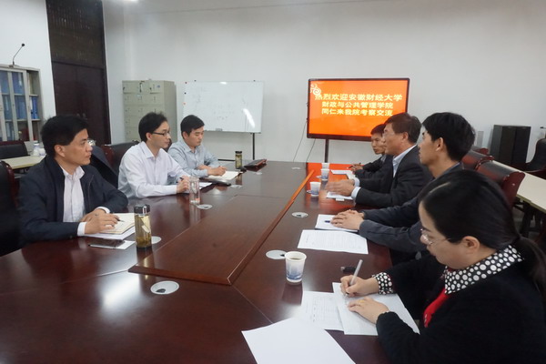 5月22日下午,安徽财经大学财政与公共管理学院副院长单学勇、公共管理学科部主任秦立建一行4人来到人文学院调研交流。人文学院党委书记伊长文、副院长刘军、周伟及MPA相关人员参加了交流座谈。