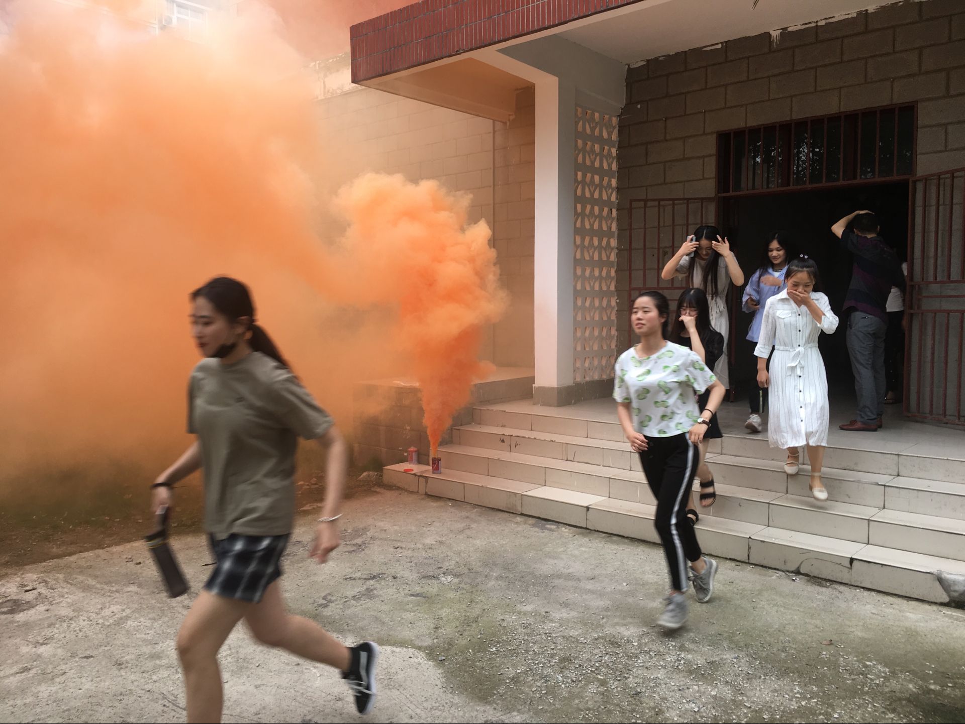 演练以避震和紧急疏散两部分,首先是现场指挥宣布演练开始,地震来袭,紧急避震,警报响起,同学们就近选择安全位置进行避险。30秒后,宣布地震暂停,立即疏散,同学们立即按指定路线快速疏散,均按规定时间疏散到指定地点。为了演练更加真实,在逃生出口燃放了烟雾弹。