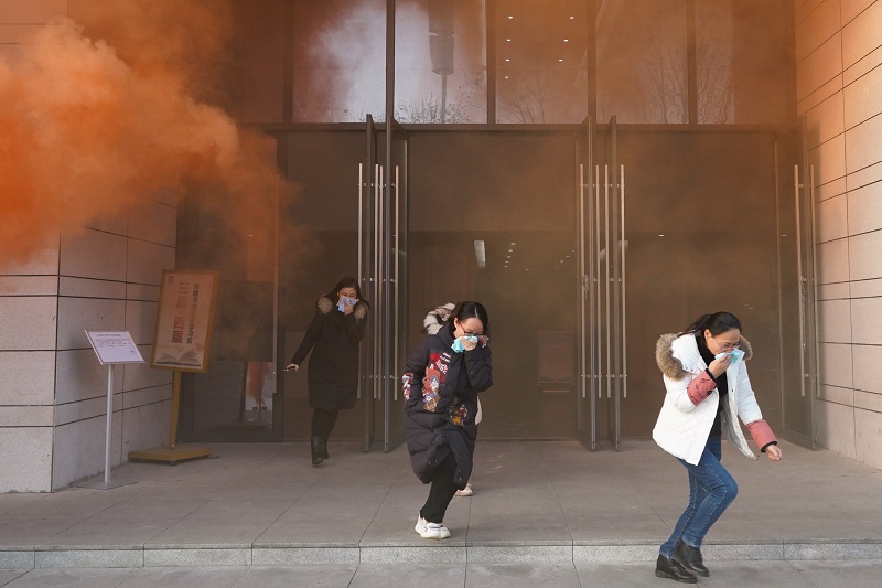 学校高层建筑紧急疏散预案立即启动,在应急广播提醒及楼层安全引导员指引下,参演师生用毛巾捂住口鼻,沿应急疏散通道迅速撤离至图书综合楼外广场,整个过程紧张有序。