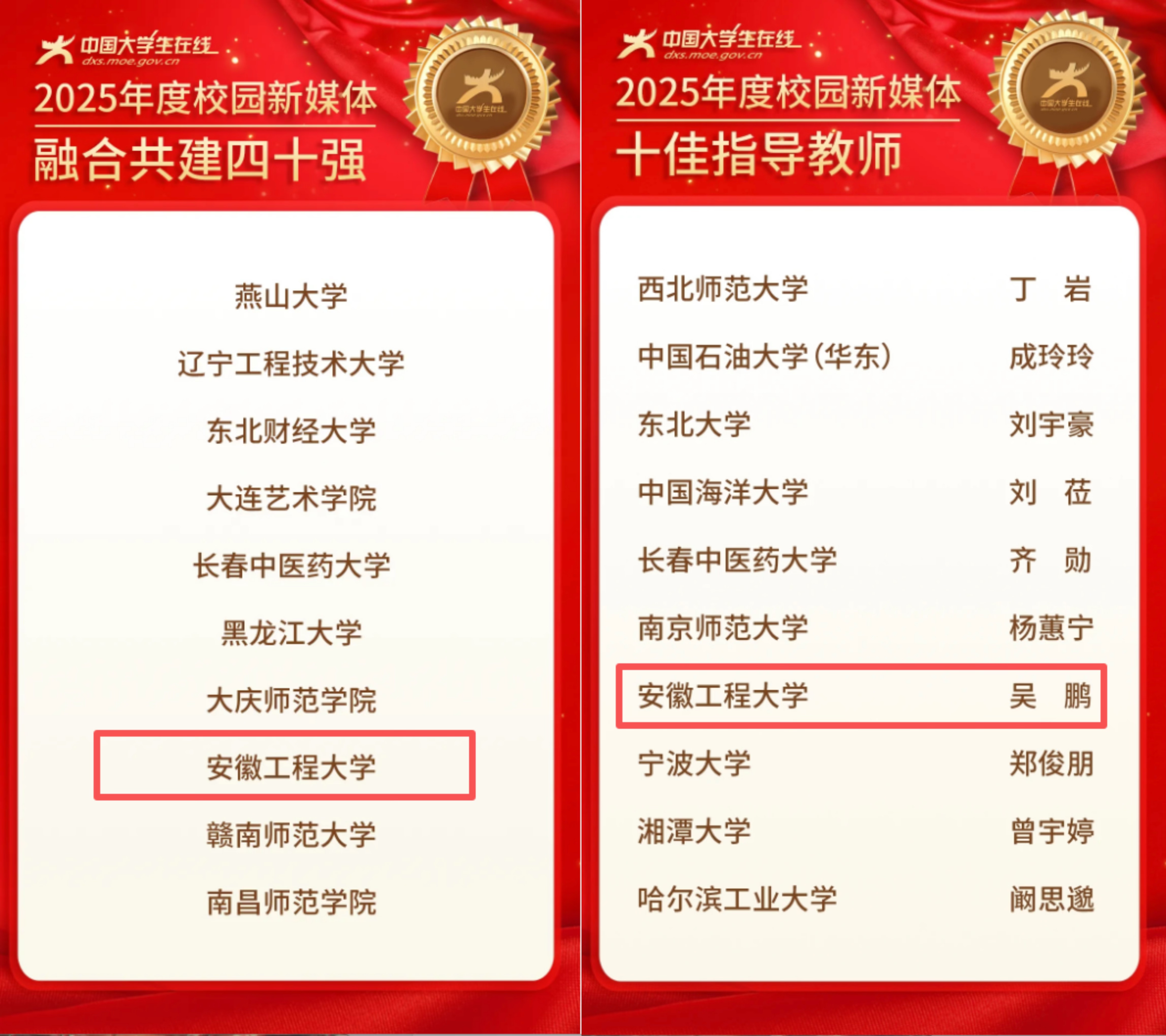 本网讯 1月8日,教育部中国大学生在线公布2025年度校园新媒体融合共建评选结果,我校连续第四年入选“校园新媒体融合共建40强”,党委宣传部吴鹏老师荣获“十佳指导教师”称号。