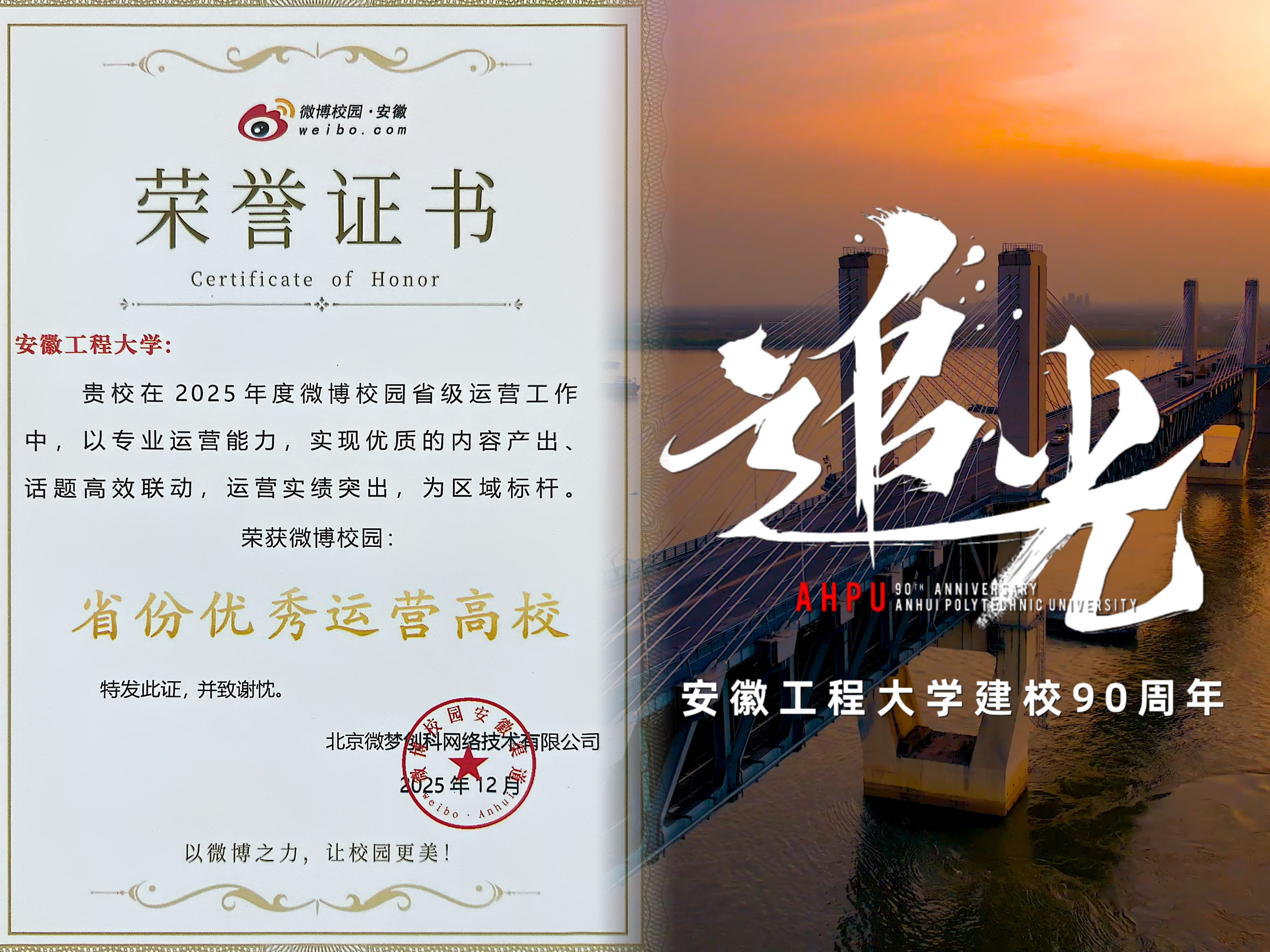 (学校官方微博荣获2025年度微博校园“省份优秀运营高校” 学校90周年宣传片《追光》网络阅读量10万+)