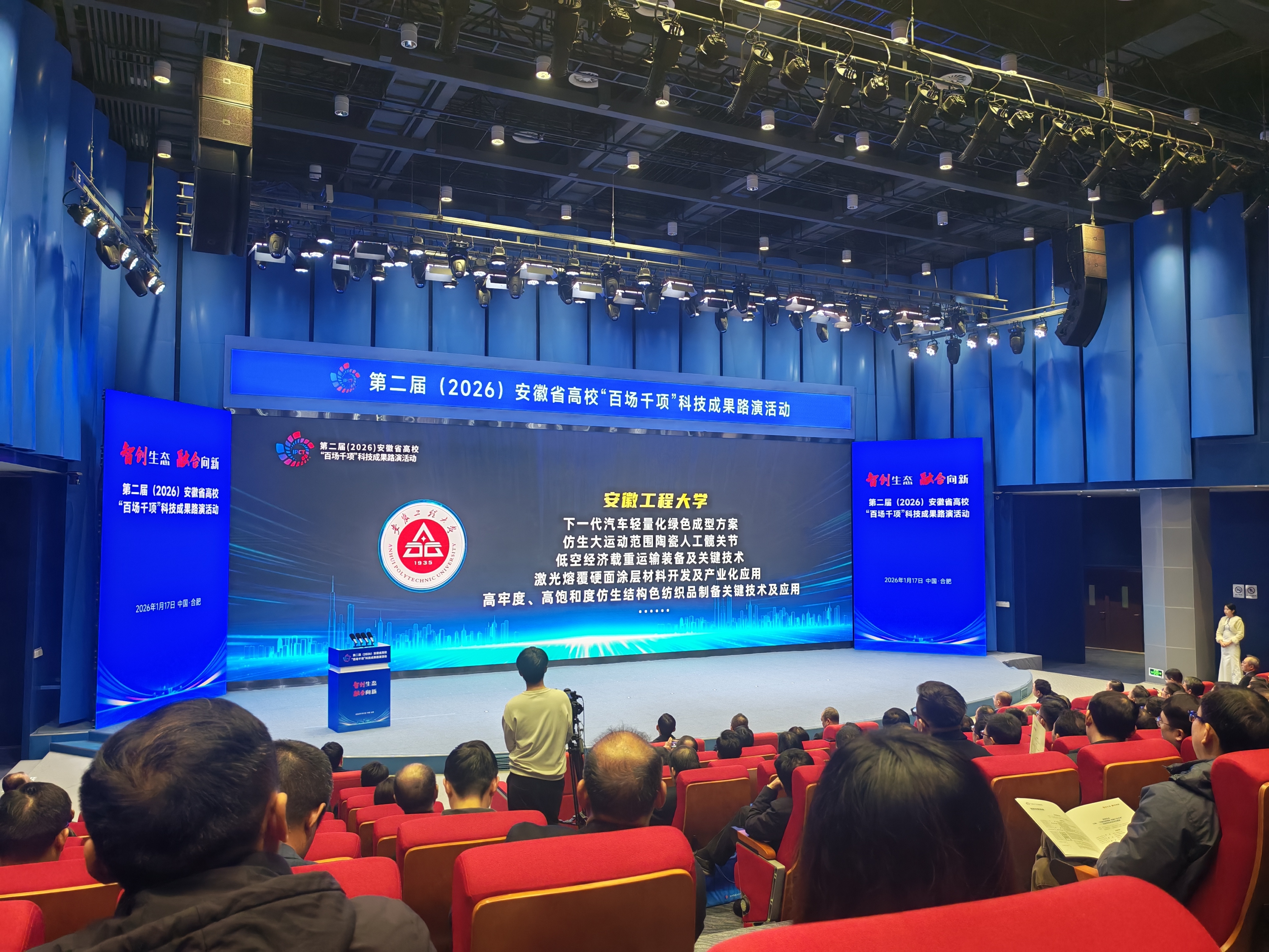 本网讯 1月17日,由省教育厅、省国资委和省工信厅主办,合肥国家大学科技园和安徽高等研究院等承办的第二届(2026)安徽省高校“百场千项”科技成果路演活动在安徽创新馆举行。我校党委书记卢平应邀出席启动仪式。来自全省高校、科研机构和各类企业共计1000余人参加活动。