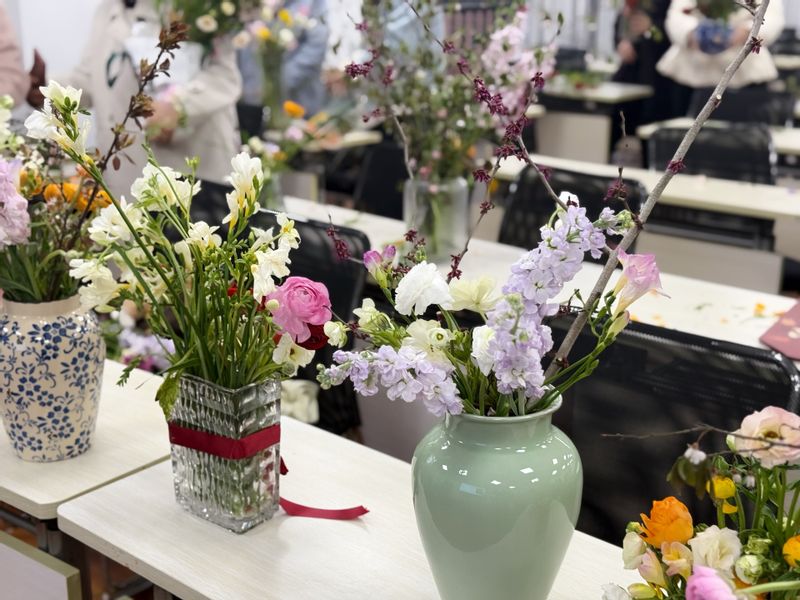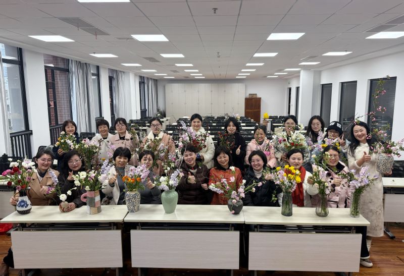 活动现场花香四溢,处处充满着春天的温暖与生机。女教师的脸上洋溢着幸福快乐的笑容,大家彼此交流插花经验和心得,现场回荡着欢声笑语。