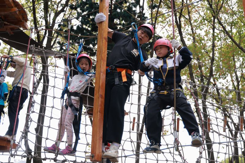 4月2日下午,安徽工程大学体验式综合素质训练基地、体育学院体验产业学院的团队老师带领2至6年级的小学生在校水杉营地、香樟营地开展了“丛林穿越”户外探险活动。小朋友们分成4队进行热身活动,在“玩转彩虹伞”的互动游戏中,色彩鲜艳的彩虹伞成为孩子们欢乐的乐园;在“丛林穿越”活动中,小朋友们在树木之间搭建的各类障碍物上努力攀爬,顺利到达终点。通过游戏,锻炼了他们的肢体协调性、团队协作能力,增强了身体素质、心理素质。