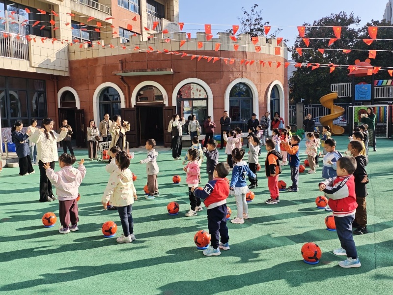 随着欢快的音乐响起,早操活动拉开帷幕。孩子们精神抖擞、整齐列队,依次展示了表演操的灵动可爱、足球操的活力四射与韵律操的俏皮欢快。特别是足球操时孩子们拿着足球,动作整齐划一,稚嫩的脸庞上洋溢着自信与活力,家长们纷纷举起手机记录这精彩瞬间。