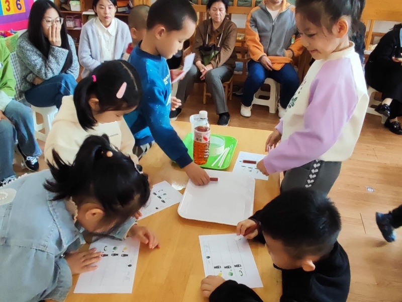 随后,李老师的科学活动《碘伏遇见维C》拉开序幕。活动中,孩子们两两合作,先大胆猜想实验结果,再亲手操作实验器材,认真观察碘伏与维C接触后的奇妙变化。家长们在旁耐心协助,与孩子一同探索科学奥秘,课堂气氛热烈而温馨。孩子们在动手实践中感受科学的魅力,培养了合作能力与探究精神,家长们也沉浸式体验了亲子互动的快乐。