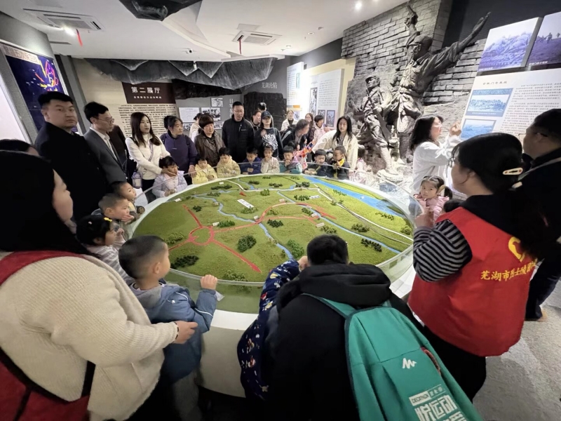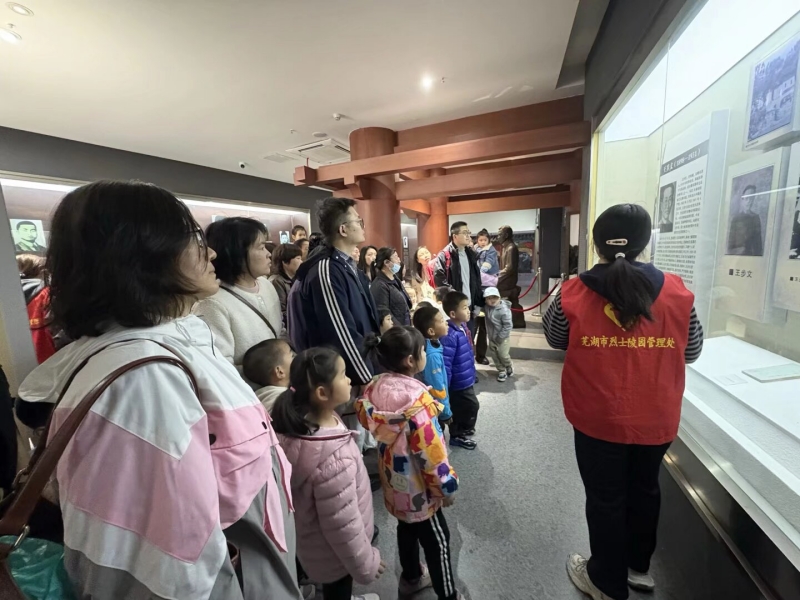 中班小朋友们在老师和家长的陪同下步入芜湖烈士纪念馆。馆内陈列的珍贵历史照片、革命文物和场景复原,生动再现了革命先辈的英勇事迹。纪念馆内讲解员以童趣化的语言,结合展品向孩子们讲述清明节“缅怀先烈、致敬英雄”的深刻内涵。