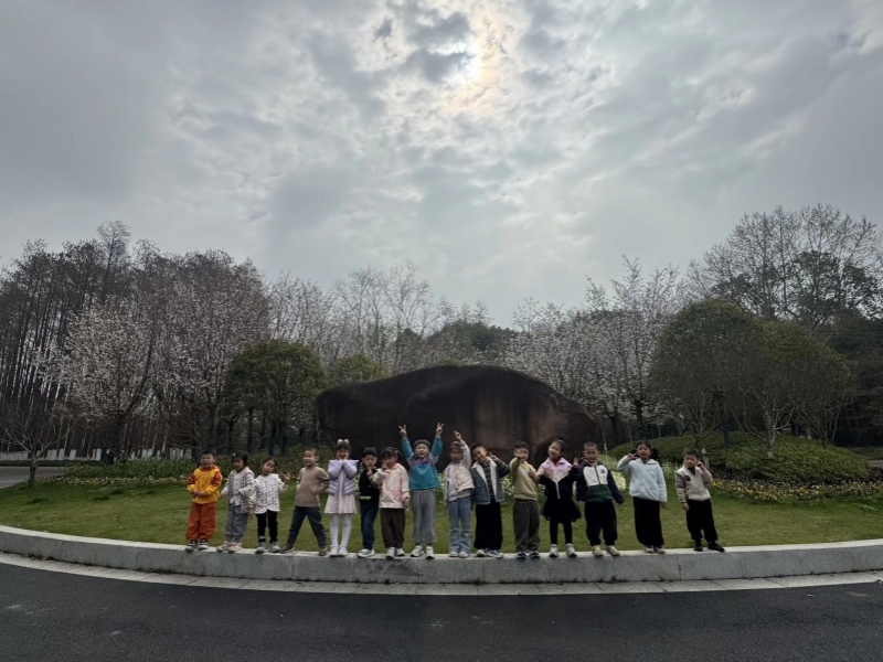 从纪念馆出发,师生家长携手走进附近的雕塑公园,开启“清明知多少”自然课堂。教师们沿途引导孩子们观察柳枝吐绿、桃花初绽的春日景象,结合自然变化讲解清明节的双重意义——“既是二十四节气中万物生长的时节,也是祭祖扫墓、传承孝道的传统节日。”孩子们围坐在草坪上,通过儿歌和互动问答了解“插柳”“吃青团”“放风筝”等习俗。中二班杜子墨小朋友兴奋地分享:“我奶奶昨天做了青团,是艾草味的!”家长们也加入讨论,讲述自己儿时清明踏青、放风筝的趣事,欢声笑语中,传统文化的种子悄然播撒。