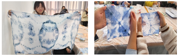 经过一段时间的创作,一件件色彩斑斓、图案各异的扎染作品相继完成。有的如蓝天白云般清新淡雅,有的似晚霞般绚烂多彩,还有的呈现出独特的抽象纹理,充分展现了传统工艺的韵味与年轻人的创意。同学们纷纷拿着自己的作品拍照留念,现场洋溢着成就感与幸福感。
