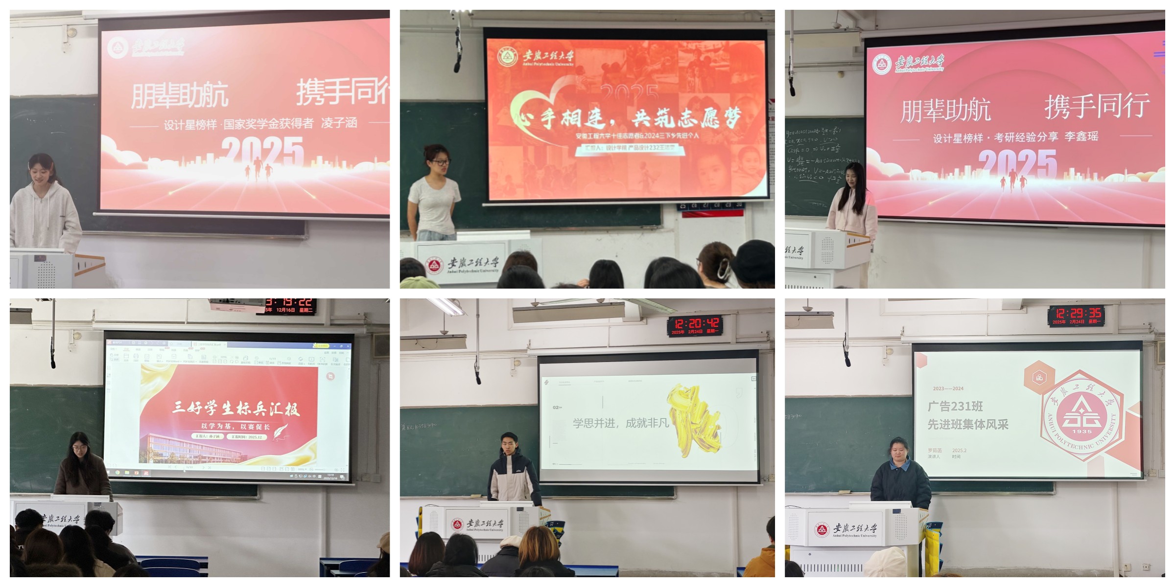 为充分发挥优秀学生的示范带动和价值引领作用,更好引导和激励广大学生奋发有为、励志成才。自2024年11月起,设计学院启动“设计星榜样”系列宣讲活动,并持续开展至2025年12月。活动以“全年覆盖、阶段深化、成果累积”为原则,邀请同辈榜样通过主题宣讲、经验分享、互动交流等形式,向全院学子传递成长正能量。“设计星榜样”团队由学院国家奖学金获得者、国家励志奖学金获得者、校特等奖学金获得者、优秀学生干部、安徽省“十佳百优”大学生、“校十佳心理委员”、星级宿舍标兵代表等优秀学生组成。