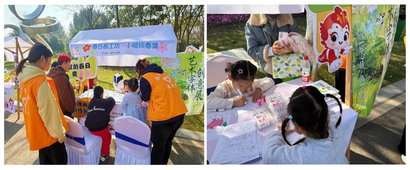 设计学院视觉传达设计系教师党支部牵头指导的“暖暖设计家”大学生志愿者队伍,重磅亮相活动核心互动板块——“春日画工坊·小暖绘春集”摊位,以专业艺术设计为依托,用暖心创意陪伴为纽带,邀请全市市民与少年儿童共赴春日之约,用笔尖色彩礼赞大好春光,携手共绘绵延春日长卷。