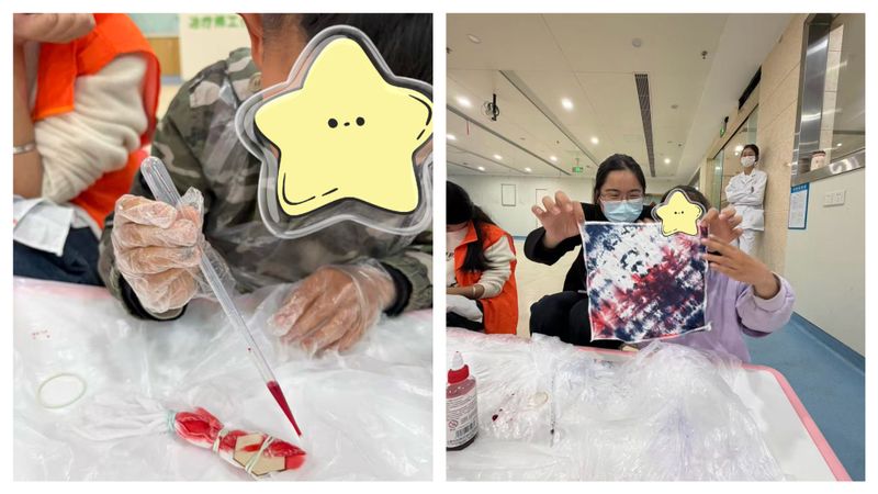 活动通过一段扎染动画短片,孩子们直观感受到“解绑惊喜”的奇妙瞬间,现场惊叹声连连。孩子们在党员师生与志愿者的“一对一”陪伴下,用皮筋和线绳在白色棉布上扎出各种造型,再浸入安全的儿童染料中。重复的捆扎动作具有天然的安抚作用,而“可预期的惊喜”则有效降低了不确定性焦虑。等待解绑的时刻,孩子们既紧张又期待,当一块块独一无二的蓝白纹样在眼前绽放时,欢呼声与笑容洋溢在整个治疗大厅。