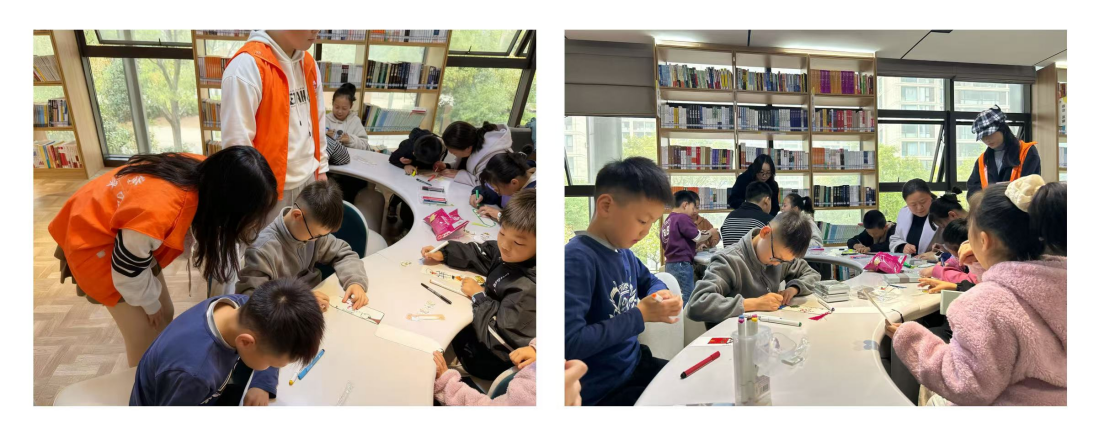 创意书签DIY环节如期而至。志愿者们充分发挥他们的专业特长,耐心细致地辅导孩子们如何运用奇思妙想绘制书签。孩子们瞬间化身“艺术小匠人”,原本空白的书签在他们的巧手下,被赋予了独特的个性与温暖,让“美好常伴书页间”有了真切的体会。