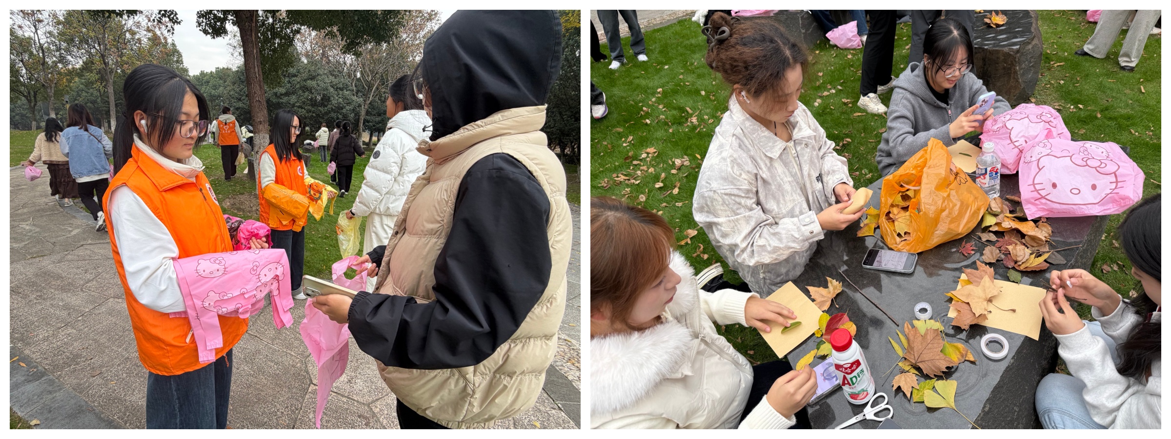 活动伊始,志愿者们迅速且高效地完成了场地布置工作。在集合区内,落叶收集袋与各类手作材料整齐有序地摆放着。现场的志愿者们热情洋溢,积极引导参与者,轻松愉悦的氛围让每一位参与者都能迅速融入其中。启动仪式上,志愿者代表发言称,落叶是自然写给岁末的深情信笺,希望大家在活动中能够放慢脚步,用心感受季节的温度。随后,同学们满怀期待地踏入园区,开启了与落叶的诗意邂逅之旅。