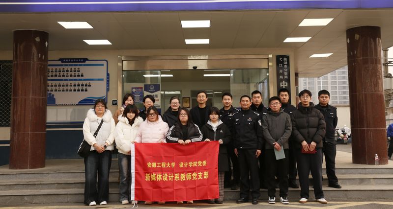 2025年12月31日,设计学院新媒体设计系教师党支部、动画与数字媒体艺术学生党支部师生代表及部分骨干教师前往芜湖市弋江区中南路派出所,开展支部共建活动。中南路派出所所长蔡义,弋江区公安局新闻宣传室主任杨天鹏参加。